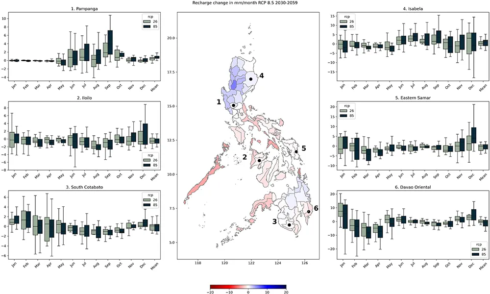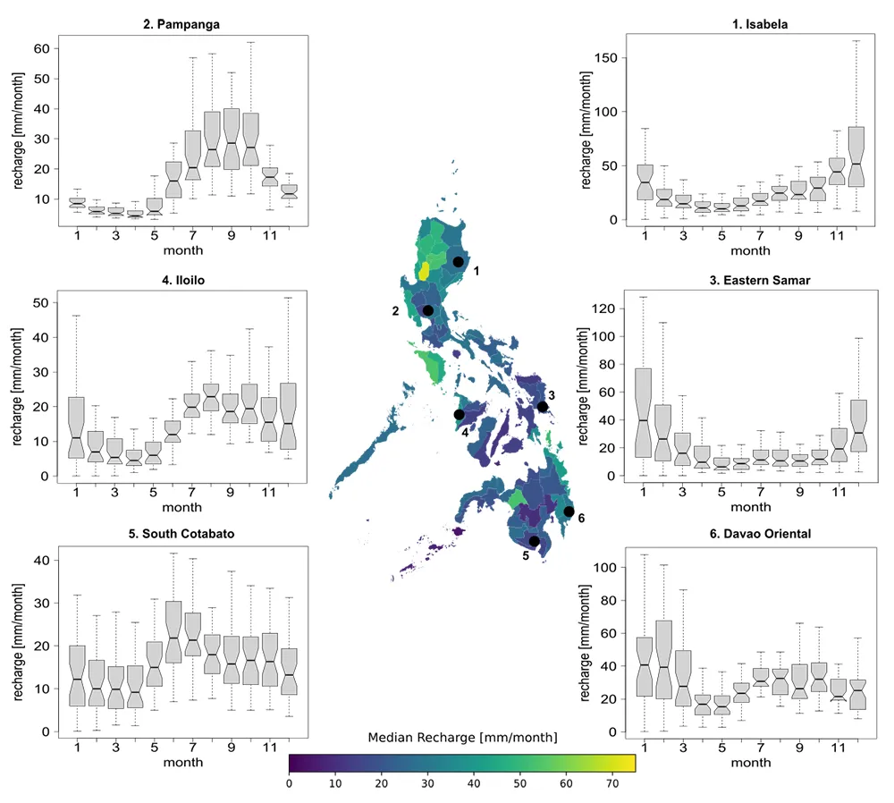 Regional comparison of components of the water cycle: Figure 3 shows the median groundwater recharge across the Philippines aggregated to provincial levels. The seasonal distribution of groundwater recharge for six selected provinces is presented using a boxplot. There is a large interannual variability in groundwater recharge in most provinces, especially in months with a higher recharge.